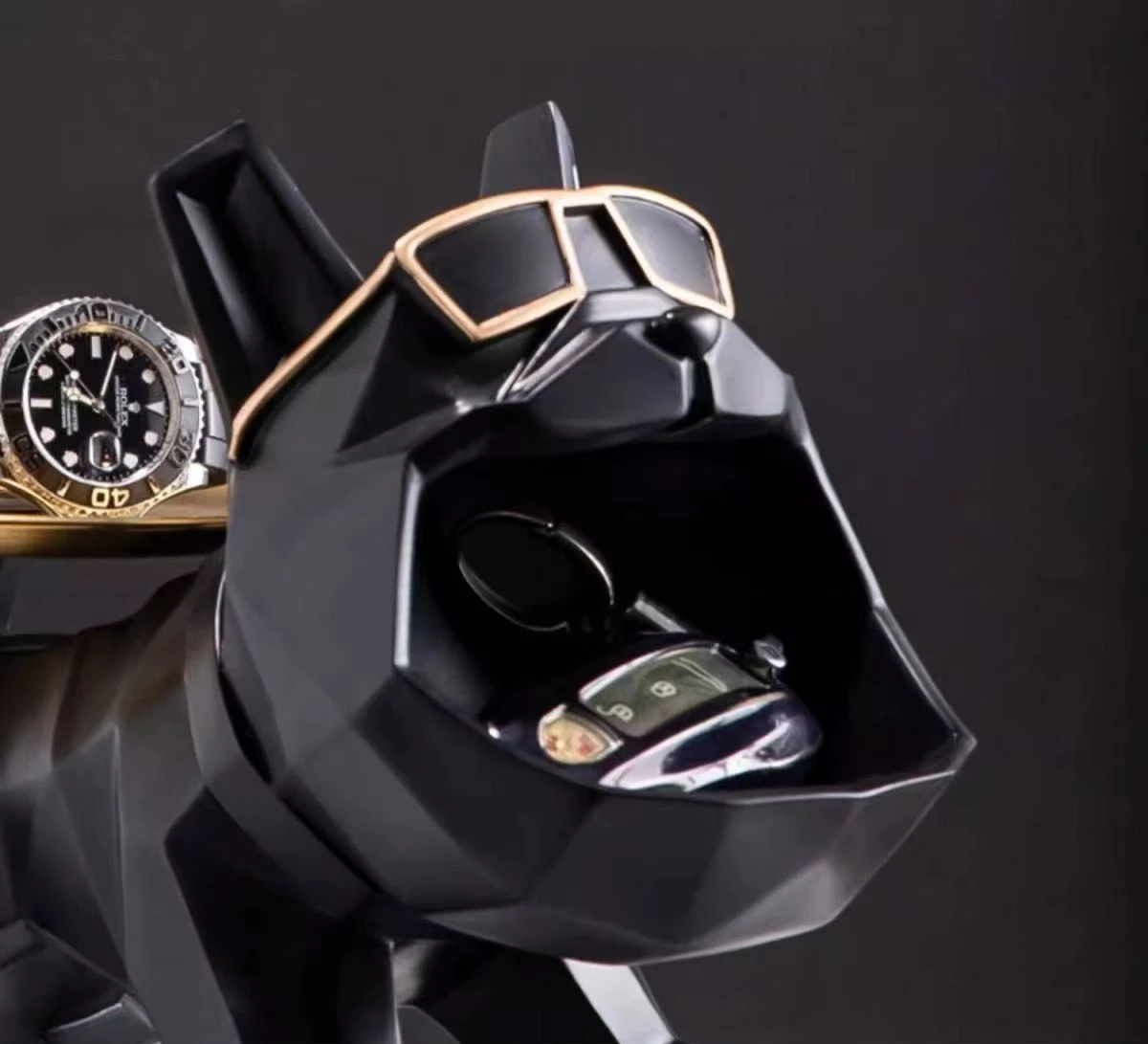 Scopri Spike, il bulldog nero geometrico con occhiali dorati e vassoio posteriore. Organizer elegante da tavolo per chiavi, orologi, portafogli e accessori. Edizione limitata dal design affilato e moderno.